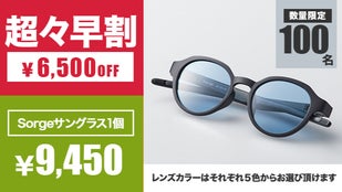 「Sorgeサングラス」 一般販売予定価格15,950円(税・送料込み)のところ100名様限定で6,500円OFFの9,450円にてお届けします。