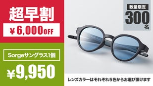 「Sorgeサングラス」 一般販売予定価格15,950円(税・送料込み)のところ300名様限定で6,000円OFFの9,950円にてお届けします。