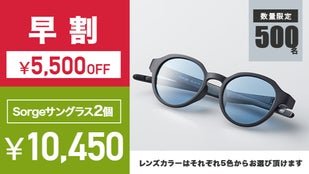 「Sorgeサングラス」 一般販売予定価格15,950円(税・送料込み)のところ500名様限定で5,500円OFFの10,450円にてお届けします。