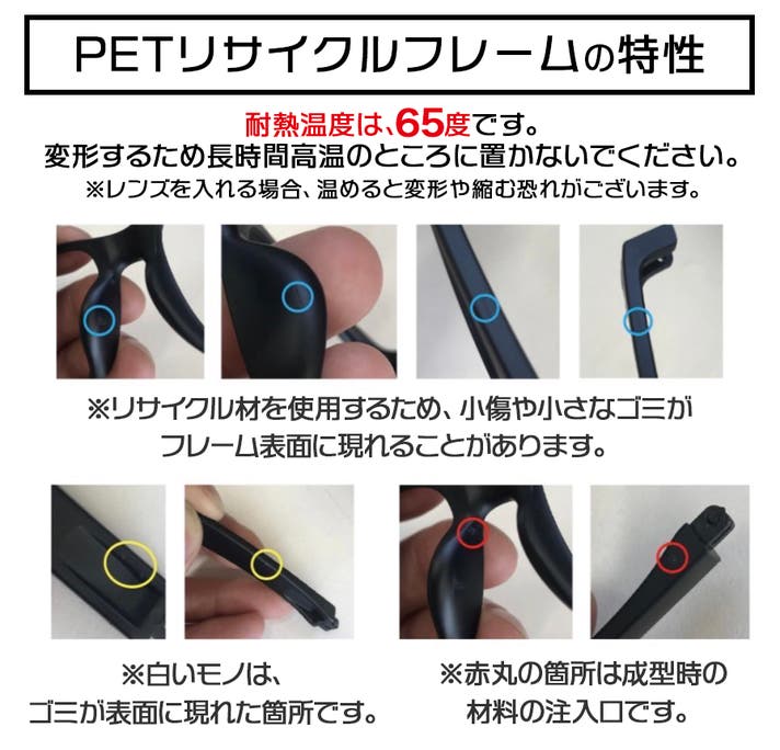 A3.弊社のサングラスは、廃棄されるペットボトルを再形成しているため、表面に白いゴミのようなものが、現れる事があります。また、鼻の部分には、材料を注入するための注入口があります。鼻の部分には、当たらない位置になっておりますのでご安心ください。