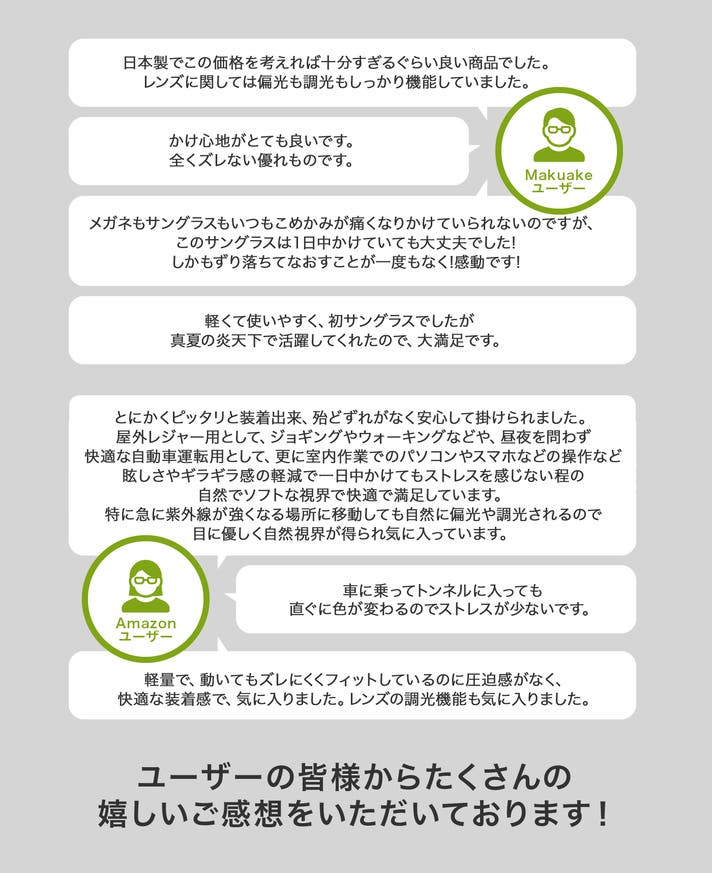 「Makuake(マクアケ)」は、実行者の想いを応援購入によって実現するアタラシイものやサービスのプラットフォームです。このページは、 プロダクトカテゴリの 「シリーズ最軽量15g!メガネの鯖江発【UV・偏光・調光】軽い・ズレないサングラス」プロジェクト詳細ページです。