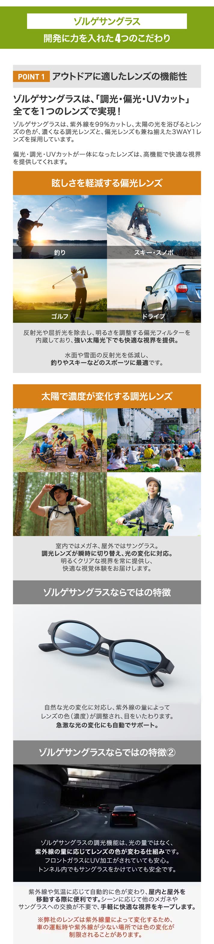 - 「偏光・調光・UV」が1つになったレンズに、利用シーンによって色が変えられる豊富なカラー展開!