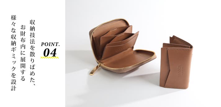 - お札を折らず美しく収納し、各収納スペースそれぞれに役割を持たせた収納美を追求した内装構造
