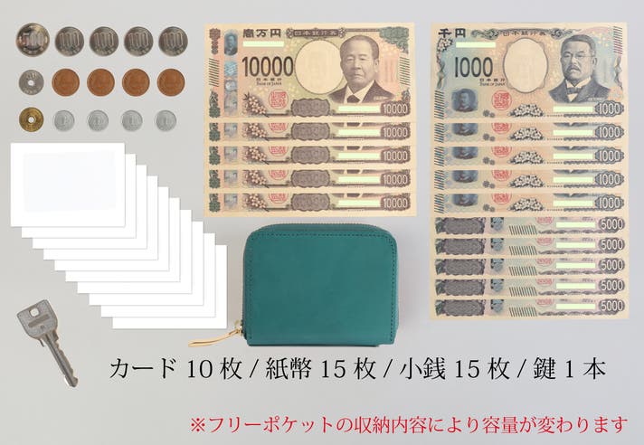 ▲お札10枚/カード10枚(カード専用ポケット2か所含む)小銭15枚/鍵1本