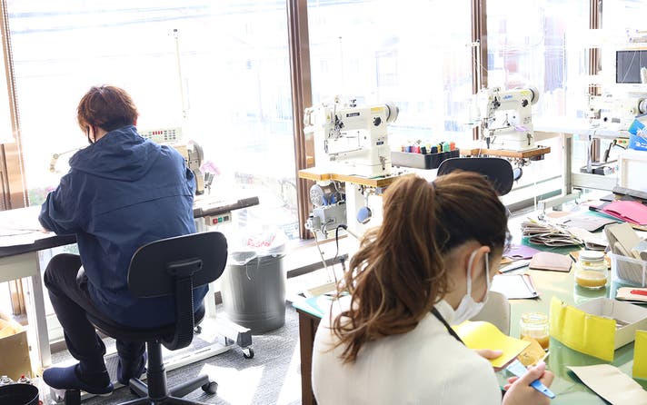 ▶革小物用の工業ミシンで丁寧に仕上げていきます