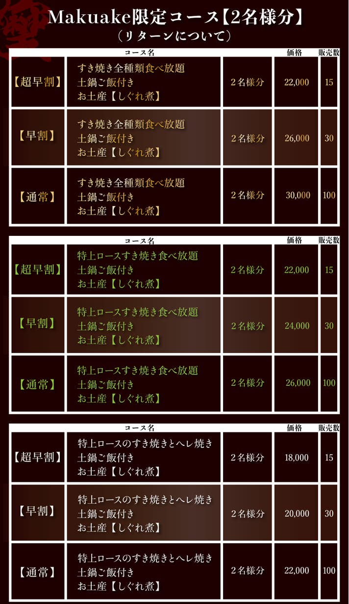 【通常】マクアケ限定 特上ロースのすき焼きとヘレ焼きコース2名様分