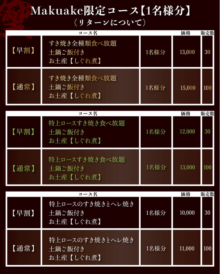 【通常】マクアケ限定 特上ロースのすき焼きとヘレ焼きコース1名様分