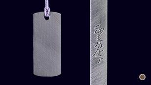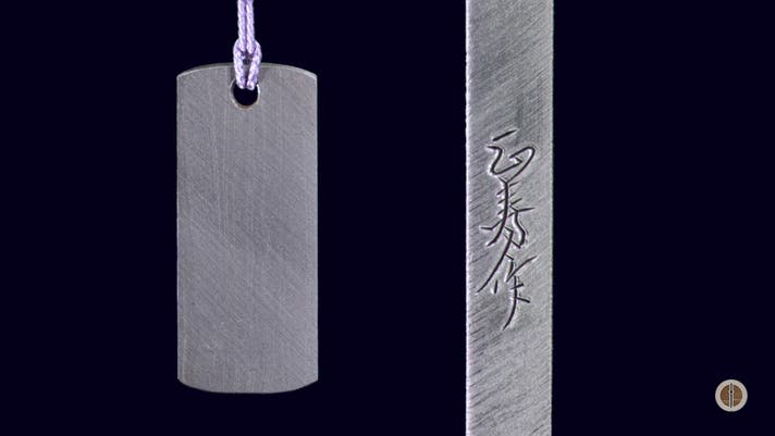 日本刀と同じ製法で鍛錬した玉鋼のプレートにお好きな文字が刻めます。自分の名前、座右の銘などを刻めば世界で一つのアイテムになります。