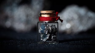 日本刀制作の過程ででた玉鋼のかけらを集め、小瓶に詰めたものです。特に美しい部分を厳選して約10gを入れています。日本刀の原料が魅せる輝きをお楽しみください。