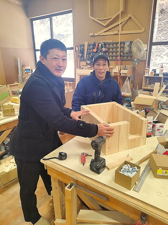 製作を行う(株)アオキウッドの青木社長は元大工さん。「猫たちの家だって、壊れたら直しますよ!」と快諾してくれました。