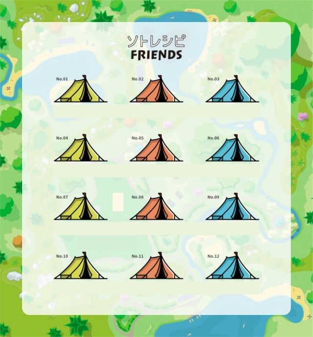 ソトレシピFRIENDSの会員になっていただいた方が入れる「ソトレシピキャンプ場」。WEB上にあるこのキャンプ場で、「会員No.」ならぬ「区画No.」を付与させていただき、自分のテントサイト「MY TENT」を設営することができます。日常でもキャンプ感を楽しんでいただけるよう、まるでキャンプ場に行っているかのような世界観作りをいたしました。