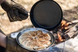 焚き火で餃子を焼いても、内層がフッ素加工なのでスルッと盛り付け。2層クラッド材×フッ素加工を実現したことで、焚き火でも料理が焦げ付きにくく、洗い物が楽になるため、焚き火料理を楽しめるようになりました。また、ステンレスは保温性も高いため、外でも蓋をしておけば温かさをキープしやすくなります。