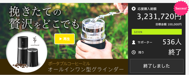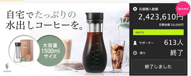 コーヒーミルとコールドブリューコーヒーメーカーを出させていただき、多くのサポーター様から喜びの声をいただくことが出来ました。