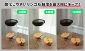 半分にカットしたリンゴを真空状態と常温で放置。12時間の経過を見ると結果は明らか。茶色くなりやすいリンゴも、真空状態であれば酸化スピードを遅らせることが可能です。