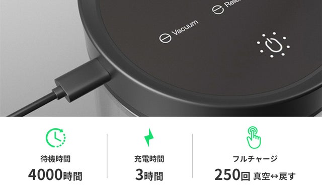 この真空キャニスターは3時間でフル充電され、真空↔リリースは250回繰り返すことが可能です。