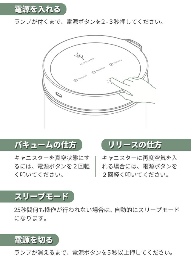 ツータップで自動真空モード、もう一度ツータップすることで容器に空気が戻ります。電源のオンオフも長押しするだけのシンプルな仕様。