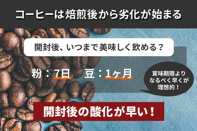 既に挽いてある豆は特に劣化が早く、開封後たった半月しか美味しくいただける期間がありません。豆の状態でも1ヶ月が目安となっており、記載されている賞味期限よりもなるべく早く飲むことが望ましいです。