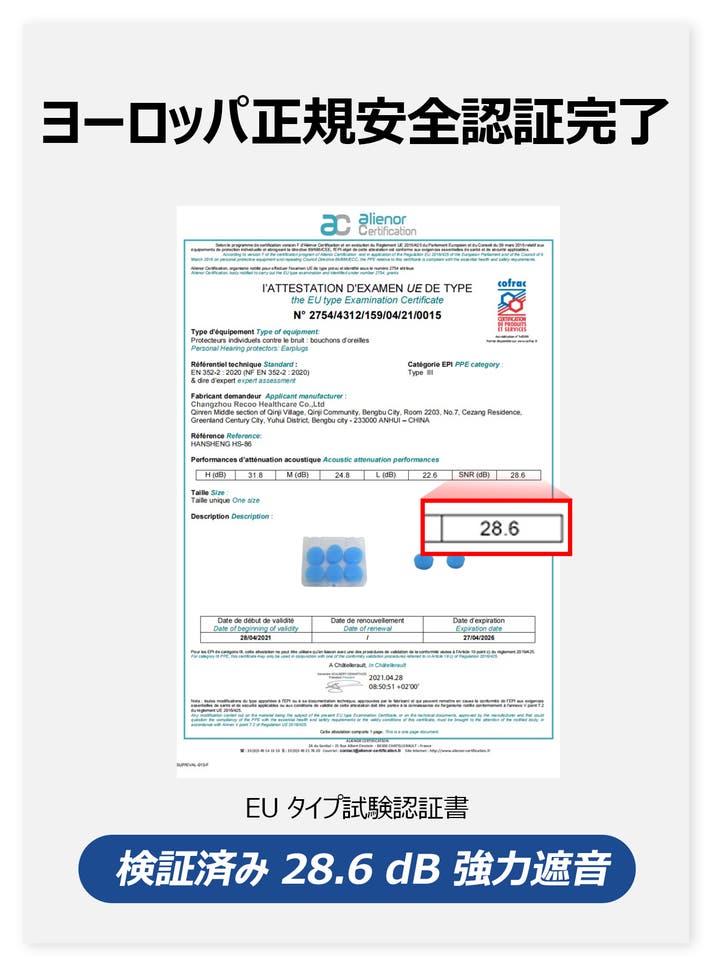 さらに、CE EN352-2(聴覚保護具に関する欧州規格)の認証も取得しており、安全性と品質が証明されています。