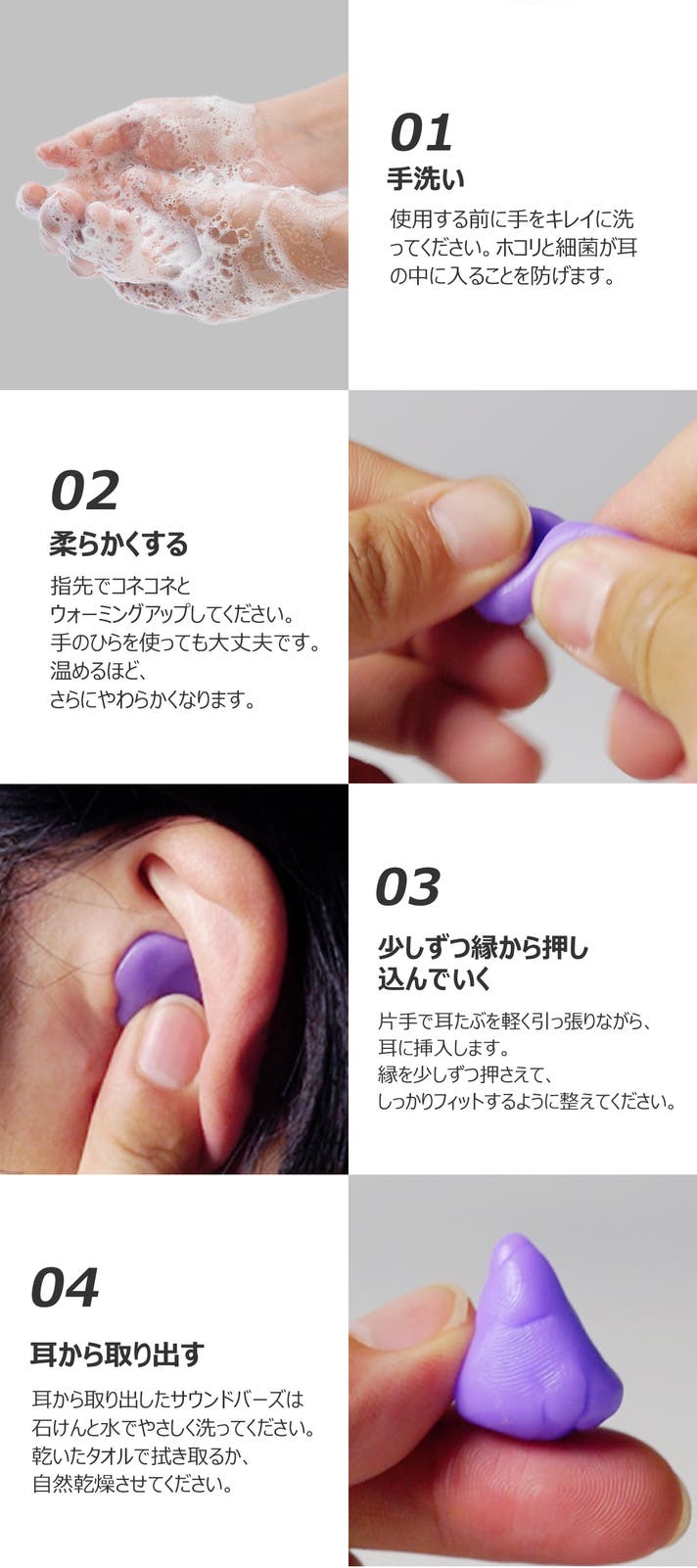 耳の奥まで詰め込む一般的な耳栓とは異なり、SoundBudsは外耳道の入口だけをやさしく包み込みます。そのため、長時間使っても耳が痛くなりにくく快適にご使用いただけます。また、SoundBudsは自分の耳にフィットするように成型できるためより快適で心地よい装着感を提供します。
