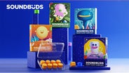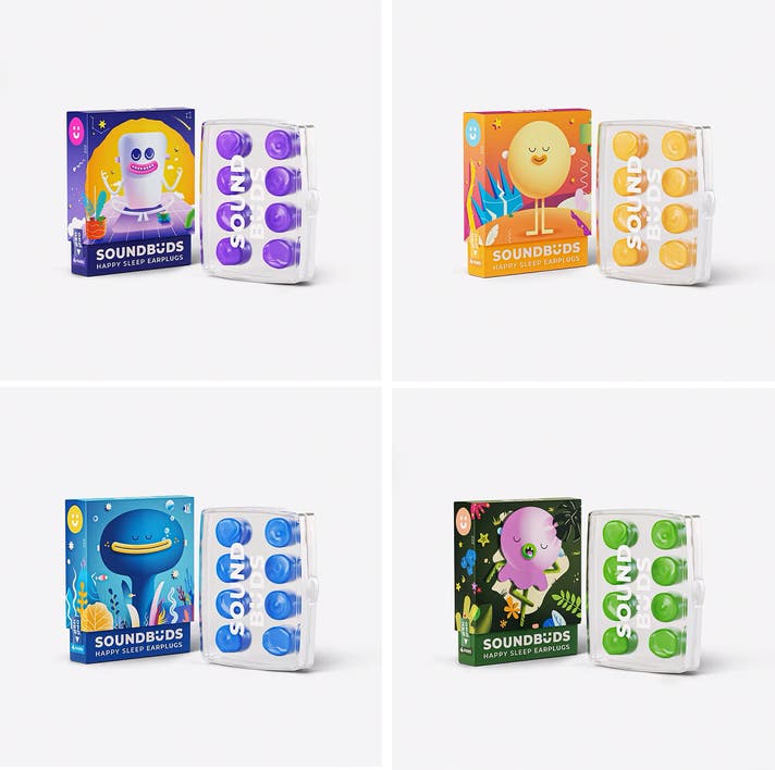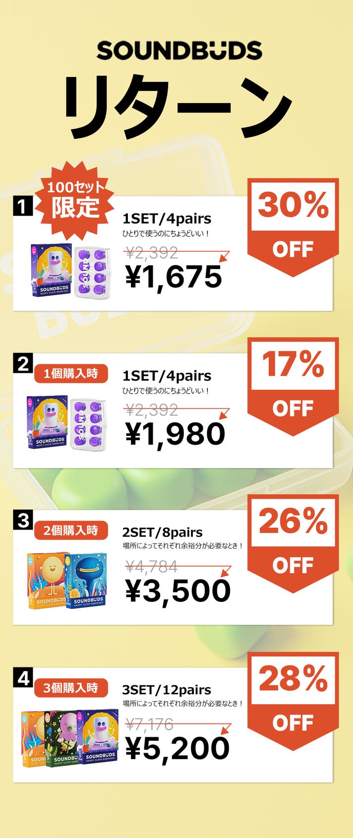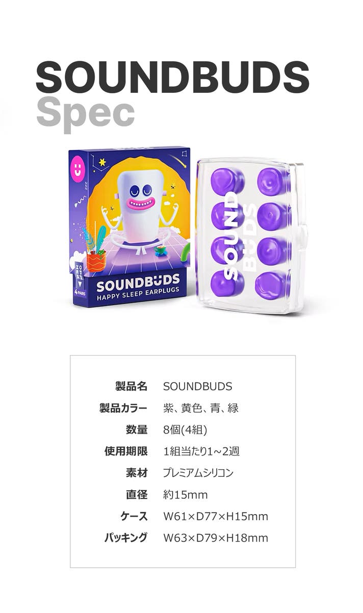 サウンドバーズは、4種類のカラー(パープル/イエロー/ブルー/グリーン)をご用意しております。それぞれに異なるイラストがデザインされたパッケージで、視覚的にも楽しめる製品です。