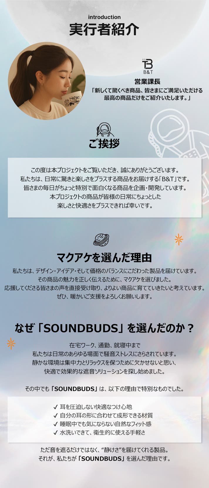 ※リターン品の配送が完了するまで、株式会社B&Tは「SOUNDBUDS」の日本における独占販売権を有する正規代理店です。詳細に関しては、ページ下部のリスク&チャレンジをご確認ください。
