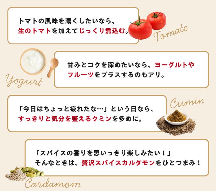 だからこそ、このスパイスキットを使って美味しく作れるようになったら、次はもっと自分好みにアレンジしてみませんか?