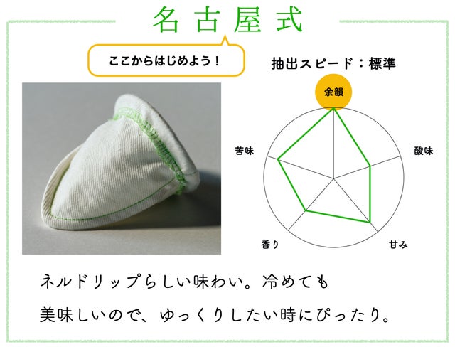 江戸時代の茶の湯まで遡るという名古屋の喫茶文化。豊かで生産性の高い土壌から、人々にはゆったりとお茶を飲む贅沢な時間を過ごす余裕があったと言われています。”名古屋式”は、ネルドリップらしいまろやかでコクの深い味わいを楽しみつつ、たっぷりのコーヒーオイルで冷めても美味しい珈琲を楽しめるフィルター。”スピール”に同梱しているタイプで、丈夫で扱いやすいのも特徴です。