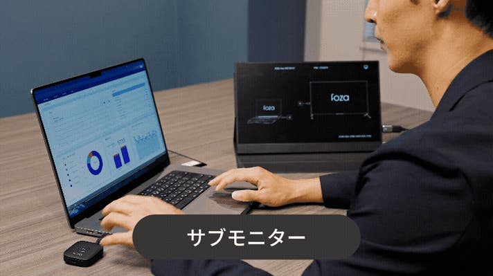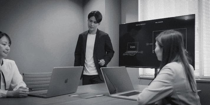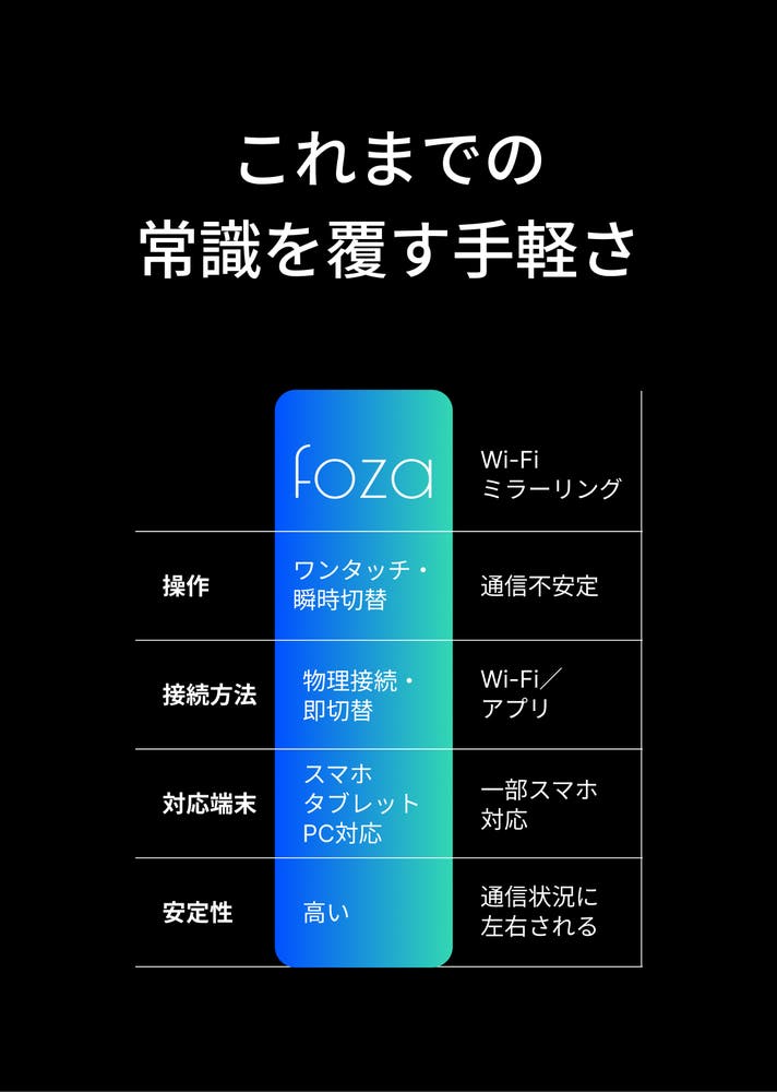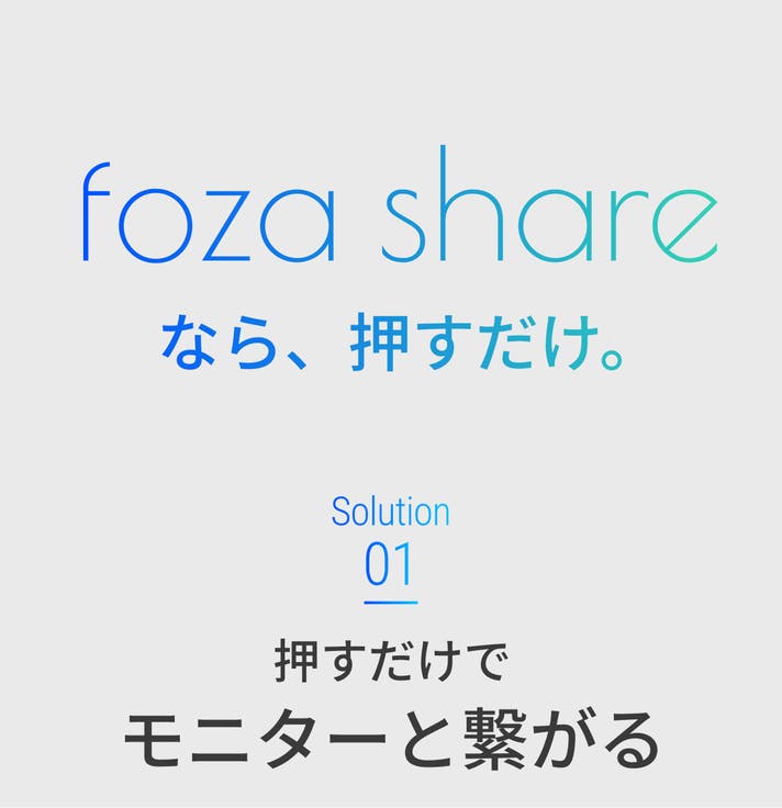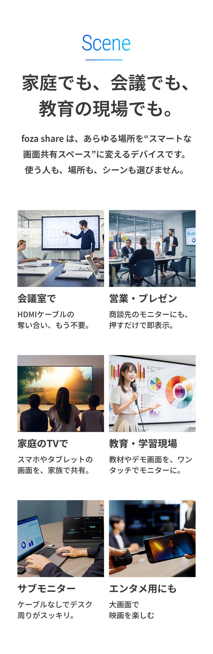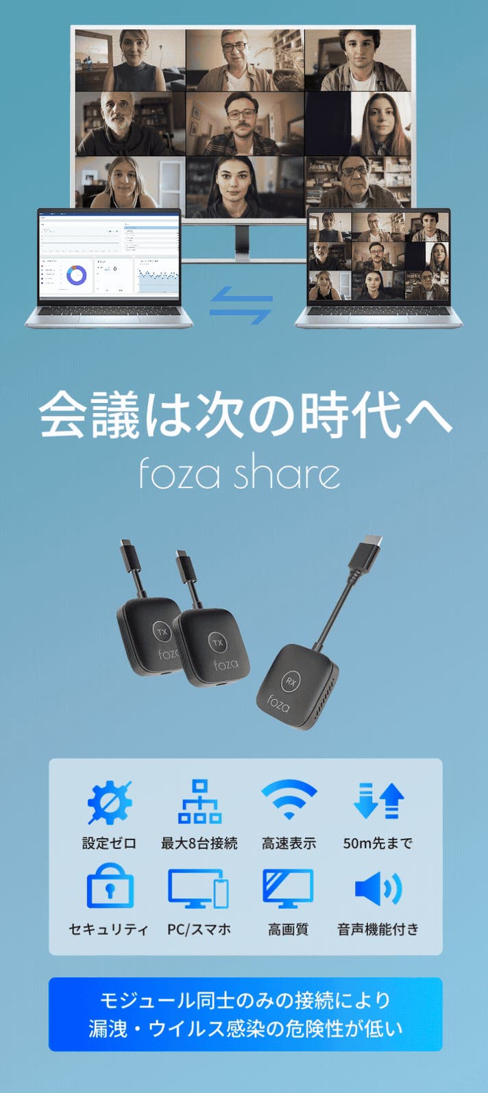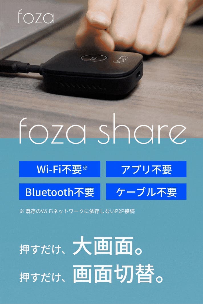 A3:「foza share」は、会議室・教育現場・家庭のテレビ・モニターで画面共有できます。PC・スマホ・タブレットの画面をケーブルなしで「押すだけ」で映せるワイヤレス画面共有デバイスです。