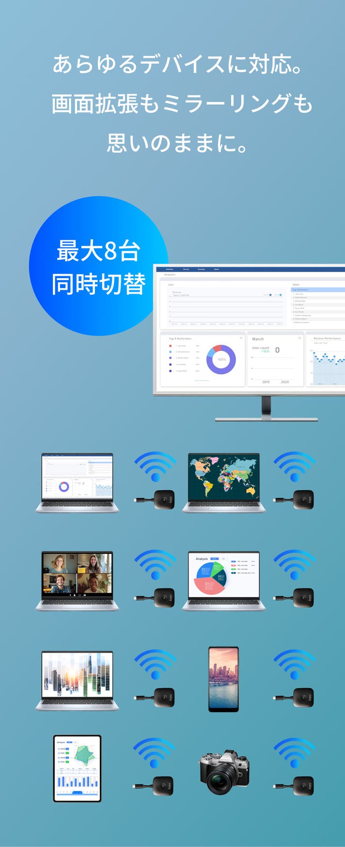 - 最大8台同時接続が可能で、スマホ、タブレットなどのデバイスにも対応。