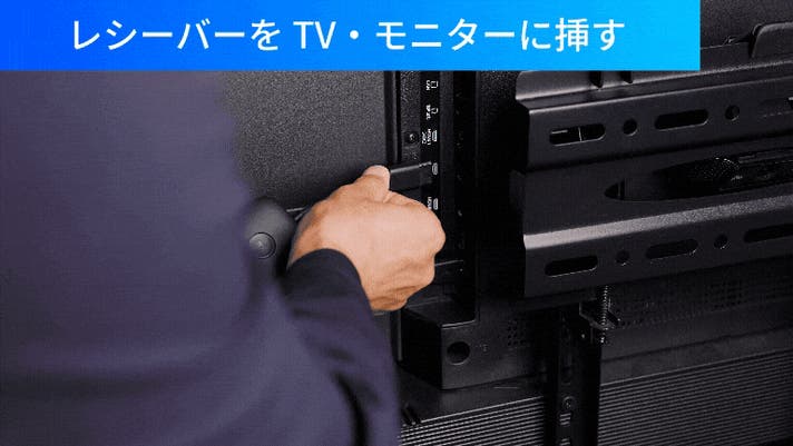 A4: ①受信機(レシーバー)をTV/モニターに挿す②送信機(TX)を端末に挿す③送信機のボタンを押す の手順で簡単に接続できます。