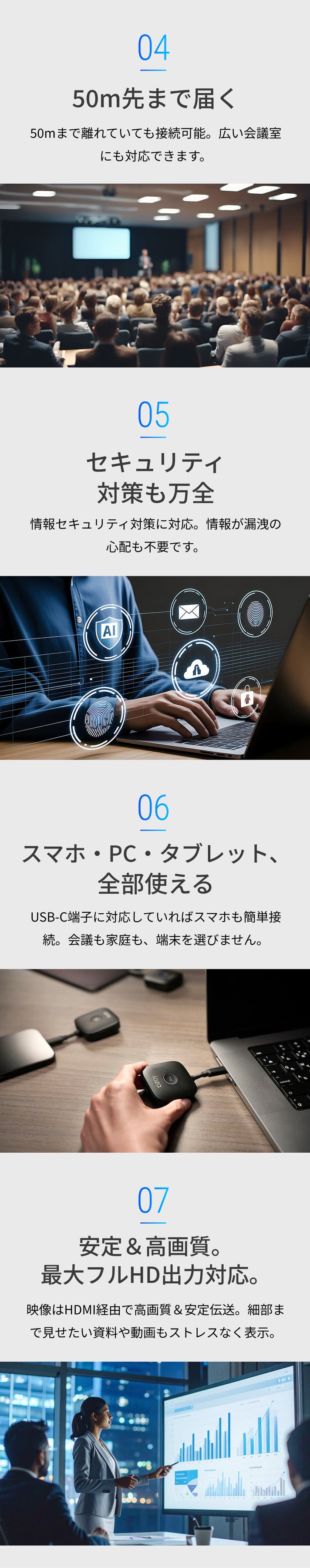 A8:送信機(TX)は、USB-Cタイプ/HDMIタイプ(追加オプション別売り)があります、PC・スマホ・プロジェクター・カメラ・タブレットなど多様な機器に対応しています。受信機(RX)は、出力先モニター/テレビ側に挿すHDMI タイプ端子です。
