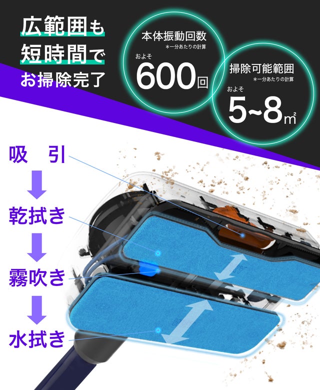 - 3D振動構造でムラなく綺麗!最大8㎡の広範囲を1分間600回の高速自動振動で素早くお掃除!