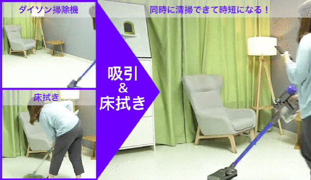 1度に吸引と床拭きができるので、掃除と床拭きを別々に行った時より半分の時間と労力でお掃除することが可能です。