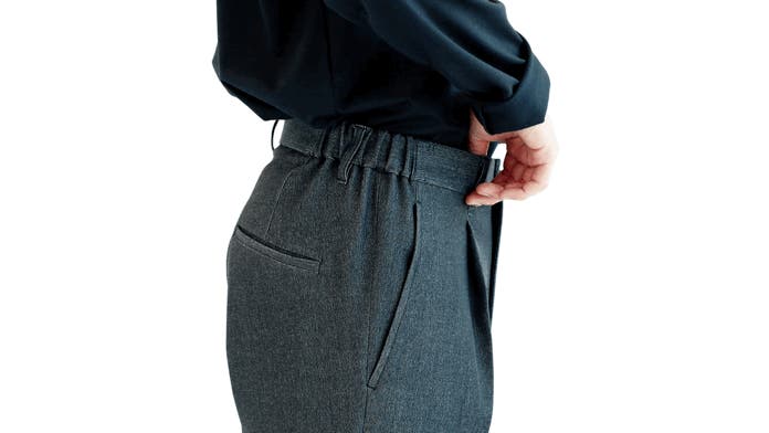 また、生地自体が伸びることに加えて、ウエストのサイド部分はゴムになっているので、より快適にお過ごし頂けます。