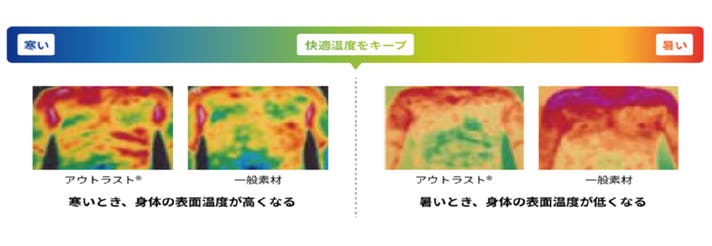※米アウトラスト社調べによると、アウトラストを使用したアウターウェアと、一般素材を使ったものを比較実験してみると、身体の表面温度は、ここまで変わります。