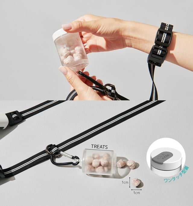 ワンタッチ式のおやつ入れがリードに付いているので、散歩の準備をするときに忘れる心配はしなくて大丈夫です。 取り外しが可能なので、使用しない時は別に保管しておいてください。