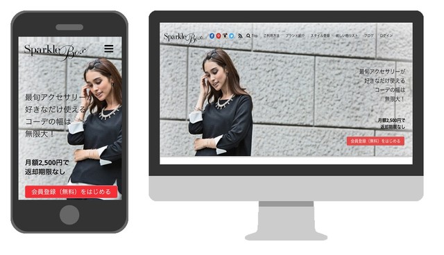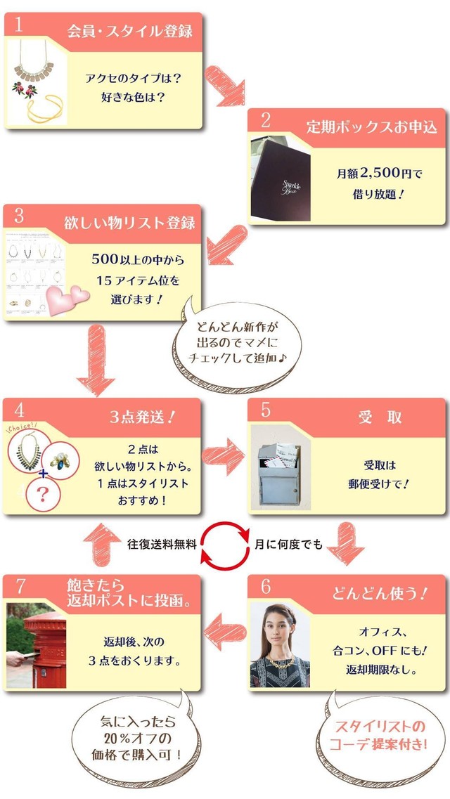 スパークルボックスのサービスは、月額2,500円で、総額25,000円相当のアクセサリー3点を何度でも借りられるオンライン月額制レンタルです。自分のファッションにあわせたアクセサリーを何度でも気軽にお試しいただけます。往復送料も無料で返却期限もなし。毎日アクセサリーを変えることだってできます。