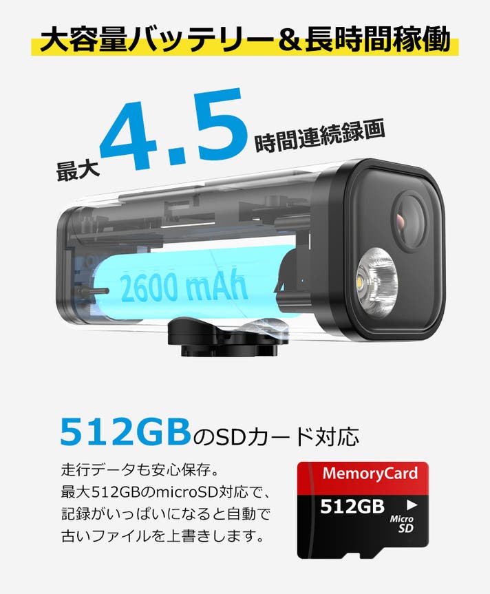 長時間録画対応!最大512GBのmicroSDカードに対応し、上書き録画機能で録画を止めることなく継続できます。
