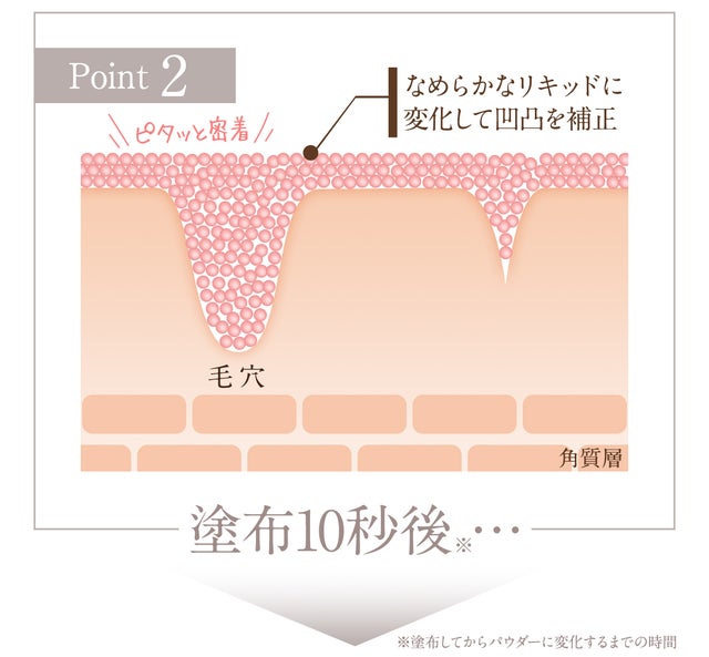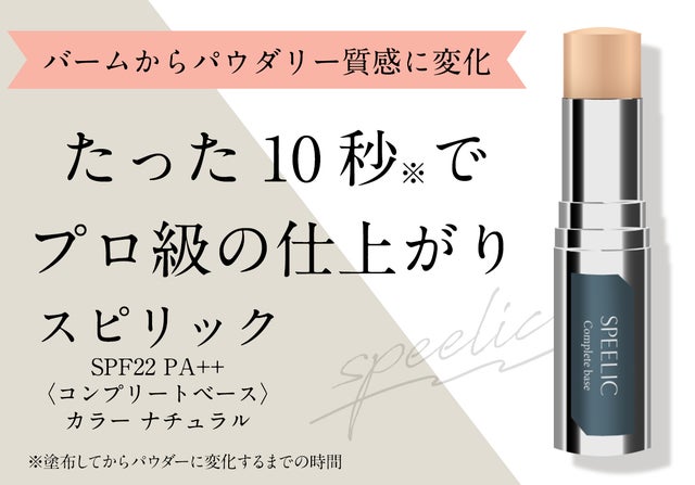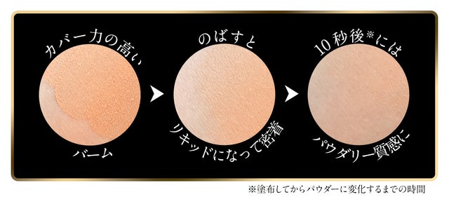 塗り広げるとバームがとろけてフラットな肌表面を形成。瞬時に肌へ密着した後、すべすべなパウダリー質感に!メイクアップアーティストが仕上げたような、スキのない上品セミマット肌を、この1本、たった10秒で完成させます!!