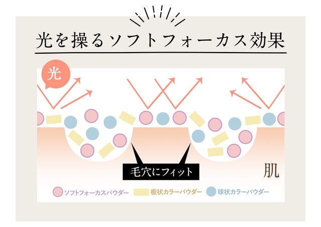 特殊な形状のソフトフォーカスパウダーが、光を乱反射させて肌の凹凸を目立たなく※させます。さらに、板状や球状のカラーパウダーが密着して、均一で明るい肌色に仕上げます。