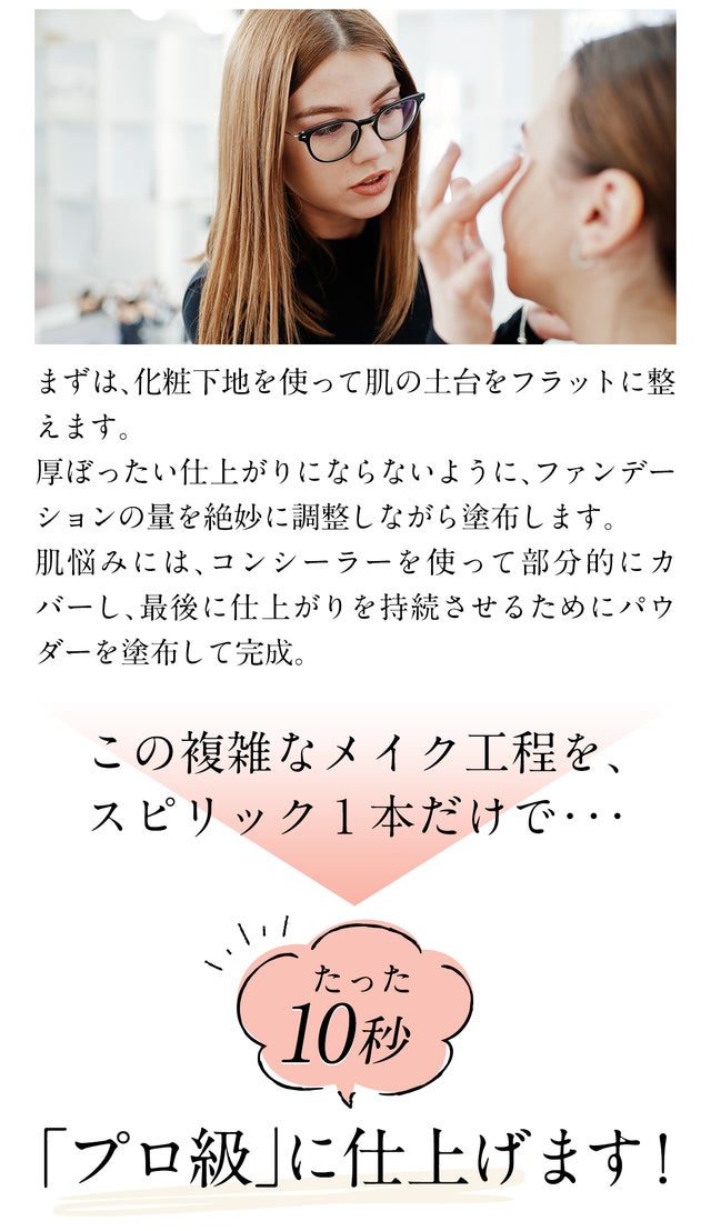 スピリックは、手間・時間のかからないベースメイクで日本中の肌をキレイに魅せたいという想いでスタートしたプロジェクトです。女性の方はもちろん、私のような男性でも使っていただけますし、テクニックや技術は一切不要なのでどんな方にも本当に使いやすいアイテムです。今までのベースメイクに満足できなかった方、ベースメイクが苦手な方、鏡を見てため息をついてしまう方、そんな方々を救いたいと本気で考えてスピリックは完成しました。