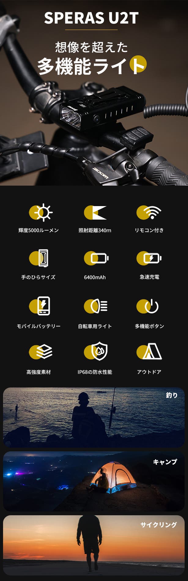 U2Tの5000ルーメン高性能ライトを使用しており、極端なアウトドア環境に対応し、より優れた照明輝度を提供します。この明るさは特に夜間のサイクリング、アウトドア活動、または緊急事態に適しており、ユーザーは心配する必要がなくなります。