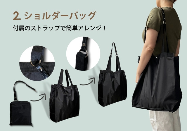 さらにこのストラップがあれば、レジ袋やお手持ちのエコバックをショルダーバッグにアレンジでき、単体でも幅広く活用いただけるとても便利なアイテムです!