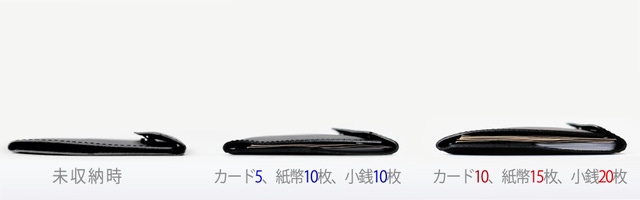 - カード10枚、小銭20枚、紙幣15枚を入れても約1.5cmの「圧倒的薄さ」