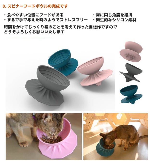 機能的で使い勝手に優れたこの「スピナーフードボウル」が愛猫家の皆様にどう受け入れられるのか楽しみと不安でいっぱいです。実際使ってみてお勧めできる製品であると思いますので、この機会に手に入れていただき、是非ご意見・ご要望を聞かせてください。