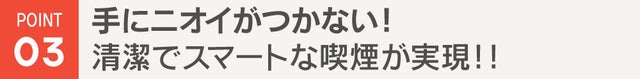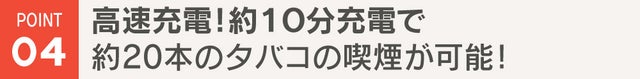 - 高速充電!約10分の充電で約20本のタバコが喫煙可能