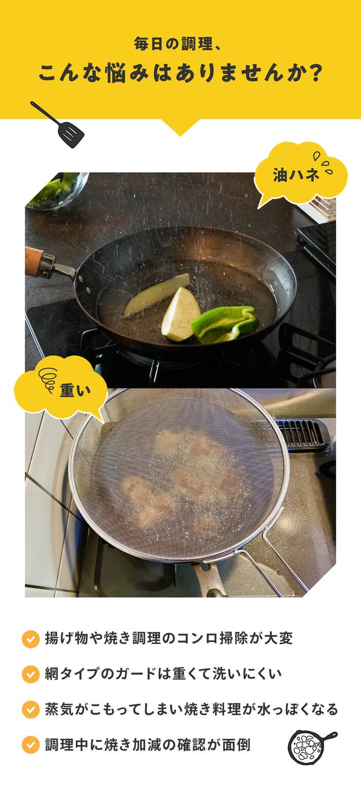 調理中の油ハネをどうにかしたい――そう思い、日本製の金属製オイルガードを使っていた時期もありましたが、重くて扱いづらく、収納にも場所を取るため、いつの間にか使わなくなってしまいました。