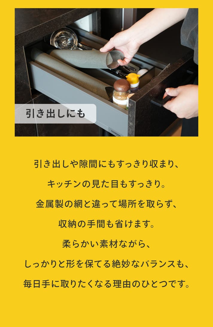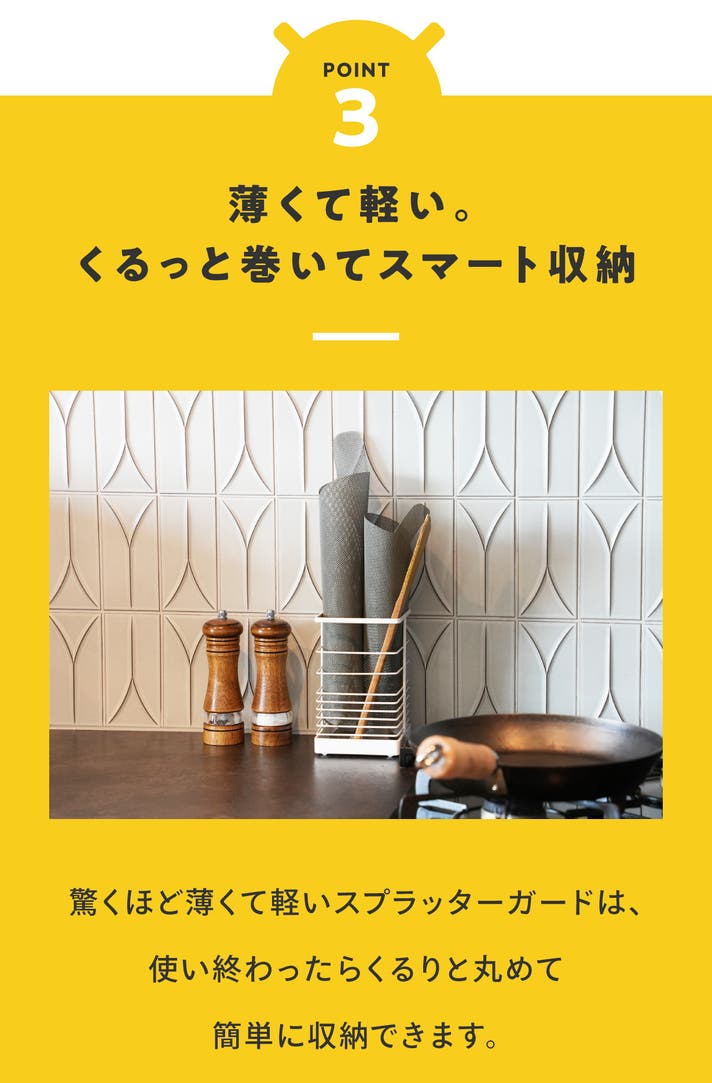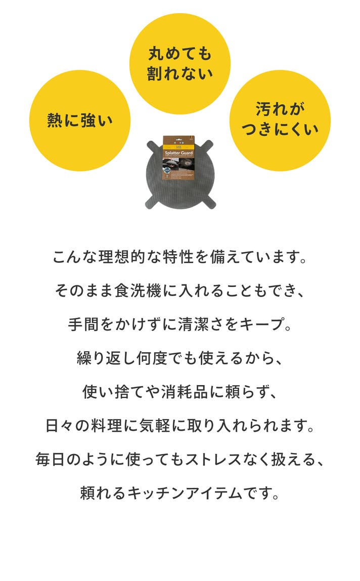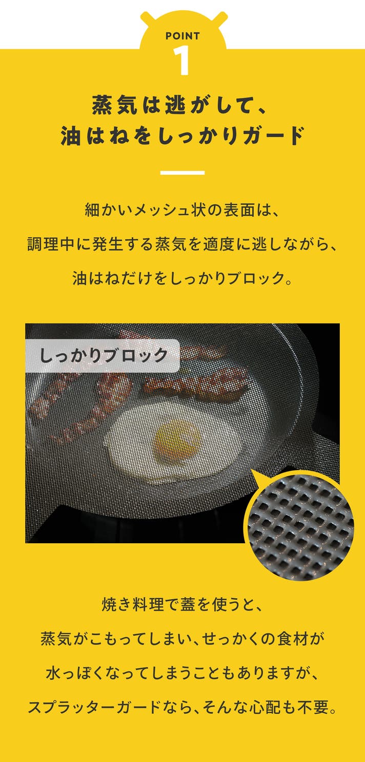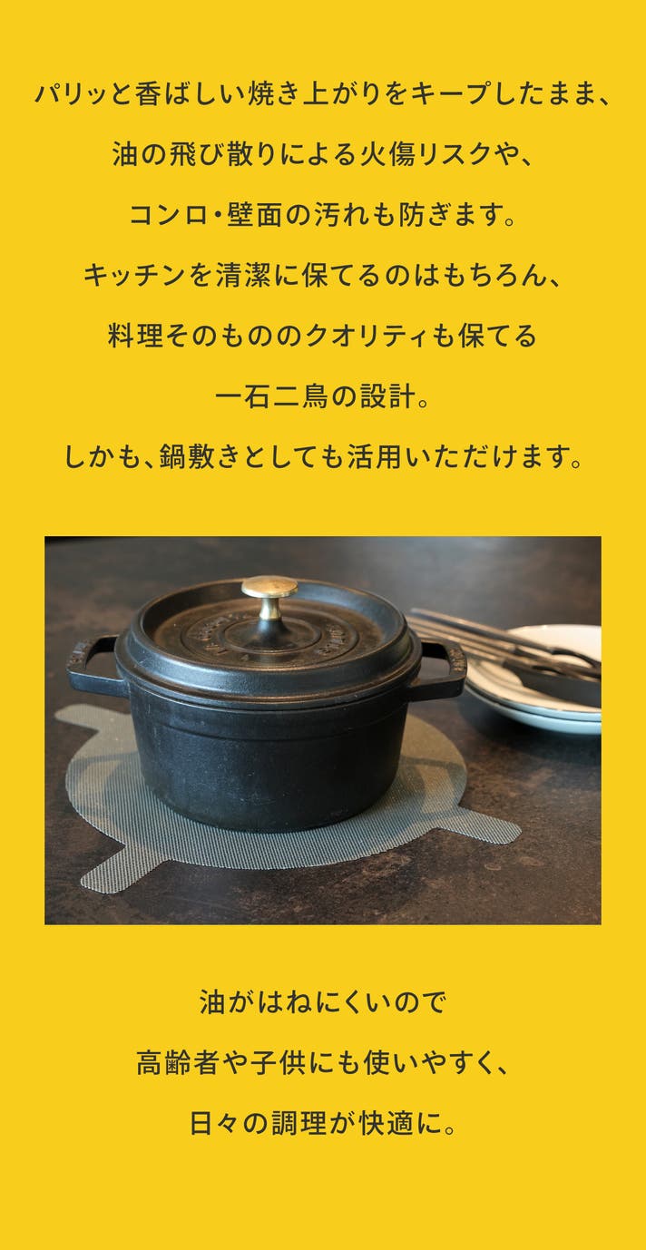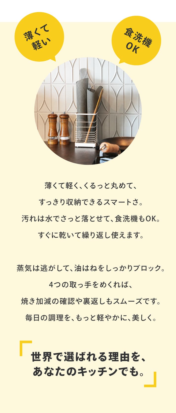 - 蒸気は逃して香ばしく、油はねをしっかりガード。調理の質を落とさず、丸めてすっきり収納。