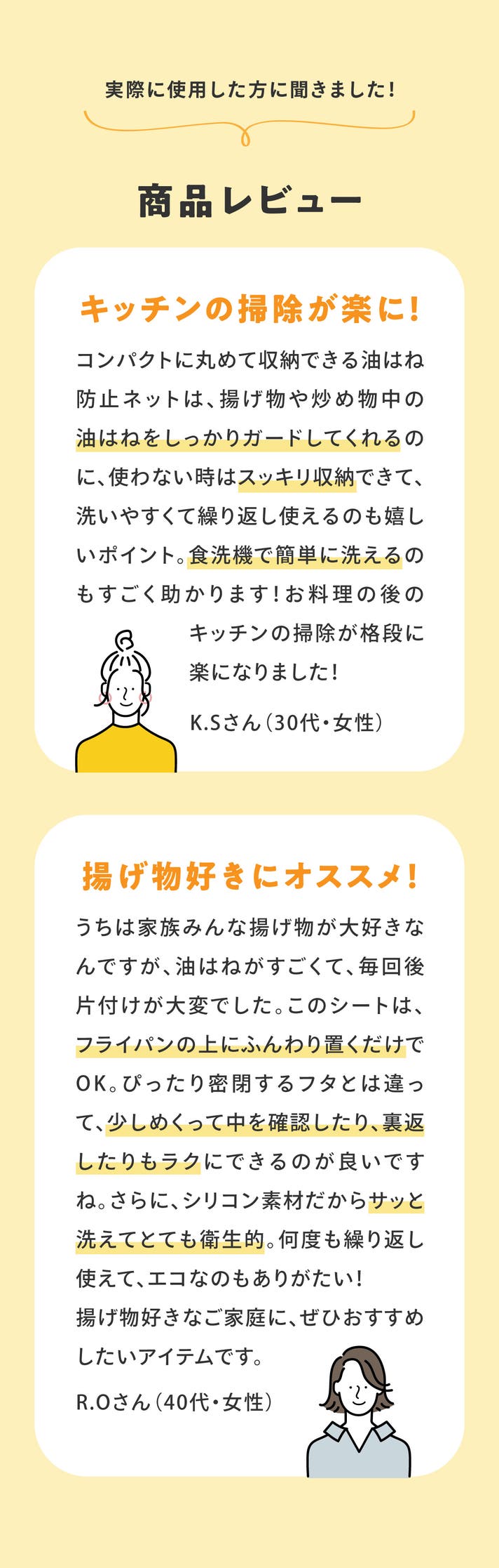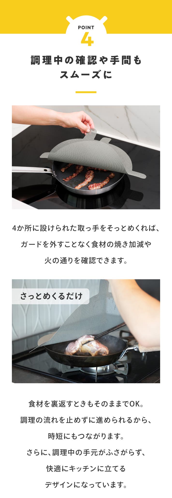 そんな中、この商品と出会い、「調理中の油ハネをここまでしっかり防ぎ、しかも軽くて洗って繰り返し使えるなんて!」と感動したのを今でも覚えています。
