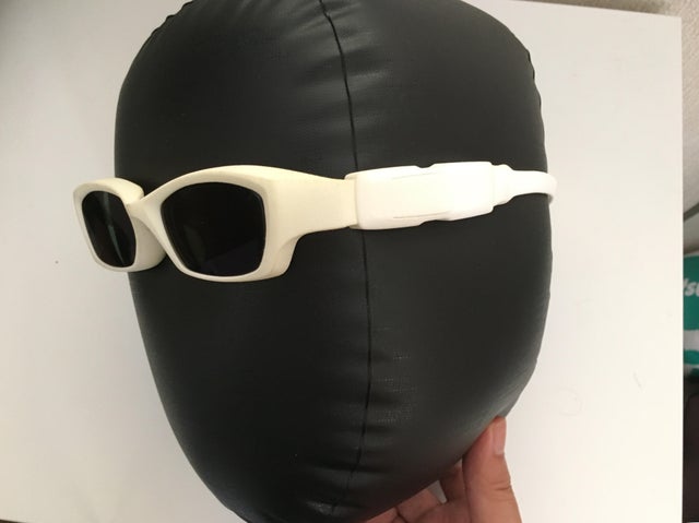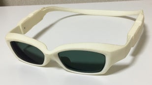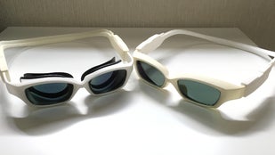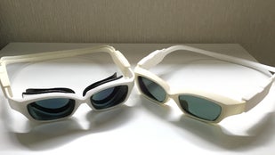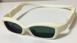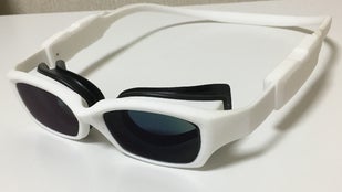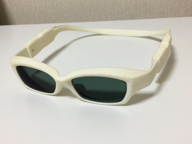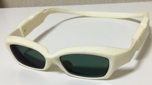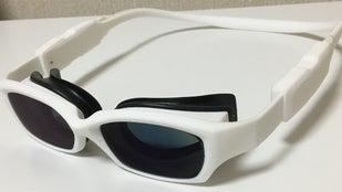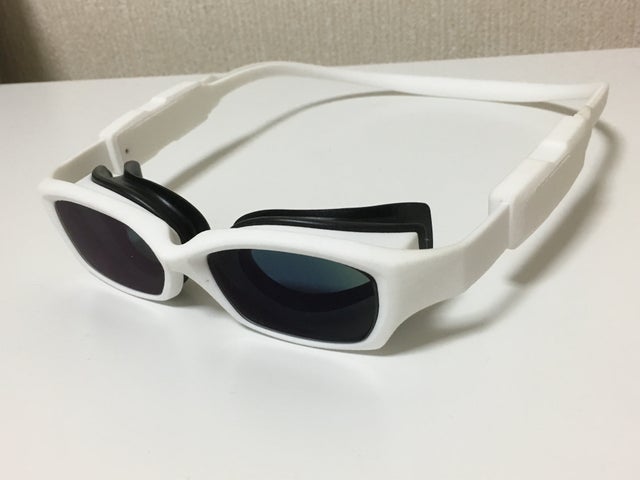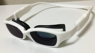 既存のメガネとは形状が違い、かぶるようにしてメガネを装着します。